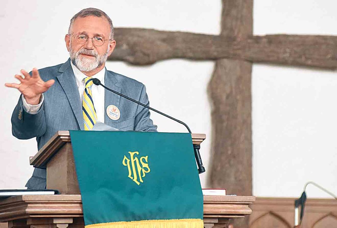 - The Rev. Jeff Allen, a United Methodist minister and executive director of West Virginia Council of Churches, speaks during the opening segment of Tuesday’s “Compassion Calls Us” event at First Christian Church in Parkersburg. (Photo by Jeff Baughan)
