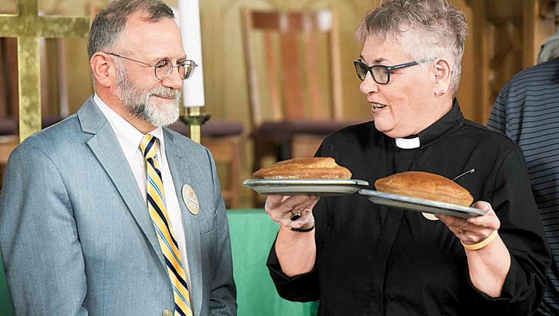 The Rev. Janice Hill, pastor of First Christian Church in Parkersburg, presents the Rev. Jeff Allen, executive director of West Virginia Council of Churches, with two loaves of unleavened bread at the end of Tuesday’s “Compassion Calls Us” meeting. Hill said the loaves were a symbol of sustainable bread and will be presented at Thursday’s meeting in Buckhannon. (Photo by Jeff Baughan)