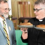 - The Rev. Janice Hill, pastor of First Christian Church in Parkersburg, presents the Rev. Jeff Allen, executive director of West Virginia Council of Churches, with two loaves of unleavened bread at the end of Tuesday’s “Compassion Calls Us” meeting. Hill said the loaves were a symbol of sustainable bread and will be presented at Thursday’s meeting in Buckhannon. (Photo by Jeff Baughan)