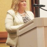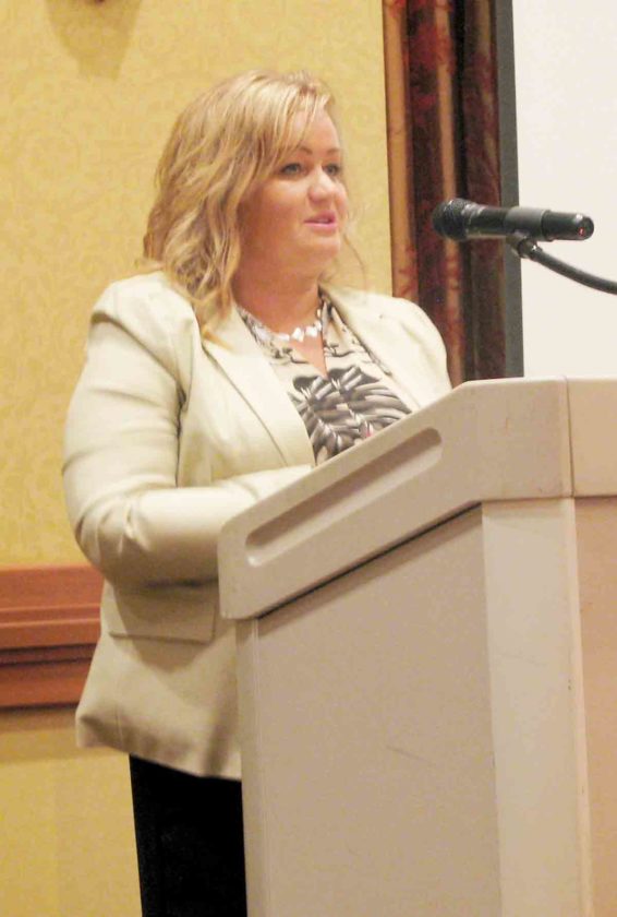 Stacy DeCicco, executive director of the United Way Alliance of the Mid-Ohio Valley, encourages the audience to raise $1,500 to buy 8,000 pounds of food for the Mountaineer Food Bank Tuesday morning during the Community Leaders Breakfast at the Grand Pointe Conference Center. (Photo by Jess Mancini)