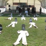 Tombstones and paper cut-outs of people depict what would happen if the Affordable Care Act is repealed at a rally of Wood County Indivisible on Monday at Bicentennial Park. (Photo by Jess Mancini)