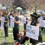 About three dozen members of Wood County Indivisible, dressed in black and carying signs, stood in the hot sun over grave stones and cut outs of bodies to depict those who would die if the Affordable Care Act was repealed.