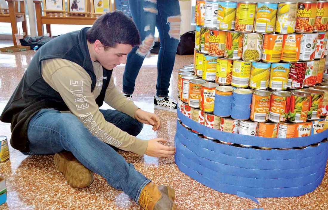 - Quentin Kennedy, a student at Parkersburg South High School, helps assemble a sculpture of donated canned foods at the WVU-P Caperton Center for Applied Technology as part of a project through the local Student United Way Board to bring attention to the issue of hunger in the area. (Photo by Brett Dunlap)