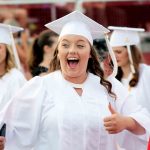 Parkersburg High School senior Morgan Nichols gives the thumbs up while walking onto Stadium Field during Thursday’s PHS Commencement Ceremony.