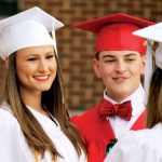 Parkersburg High School seniors Samantha Williams, left, and Evan Wiseman, center, pose while Emily Williamson takes their picture prior to the start of Thursday’s PHS Commencement Ceremony.