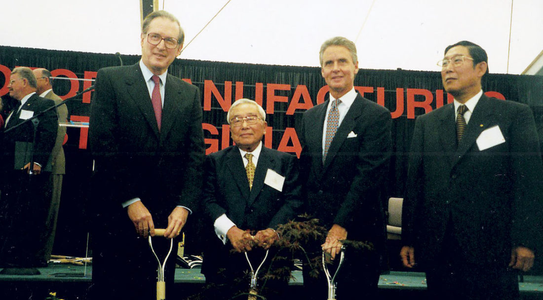 Photo Provided From left, Senator Jay Rockefeller, Mr. Eiji Toyoda, Gov. Gaston Caperton and Mr. Hiroshi Okuda break ground for Toyota Motor Manufacturing West Virginia Inc. in September 1996.