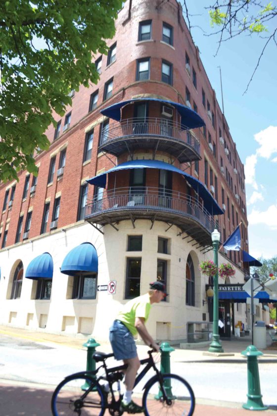 - Photo by Michael Kelly A bicyclist rides past the front of the Lafayette Hotel. The hotel is marking its 100th anniversary this year.
