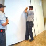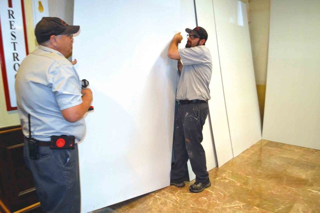 Photo by Michael Kelly Tradesmen Johnny Carpenter (left) and Anthony Drost move drywall as finishing work proceeds on the space that will accommodate a Starbucks inside the Lafayette Hotel. The coffee bar is expected to open before July 1.