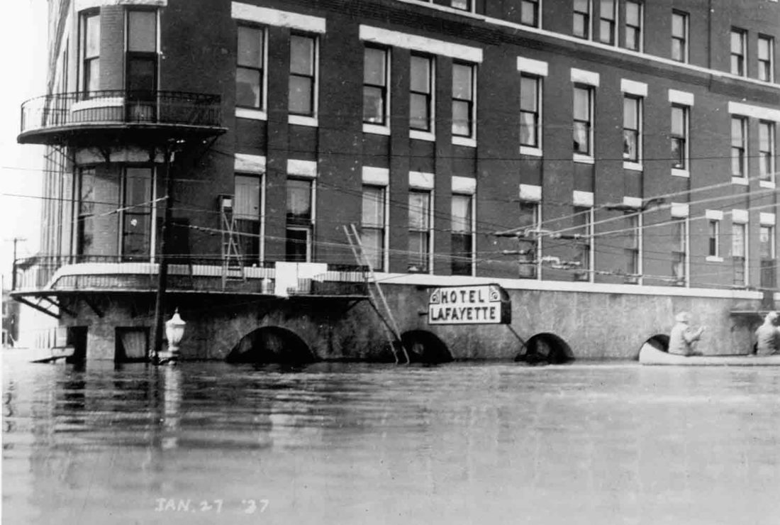 - Courtesy of Special Collections, Legacy Library, Marietta College Catastrophic flooding hit downtown Marietta in 1937 and extensively damaged the main floor of the Lafayette Hotel.