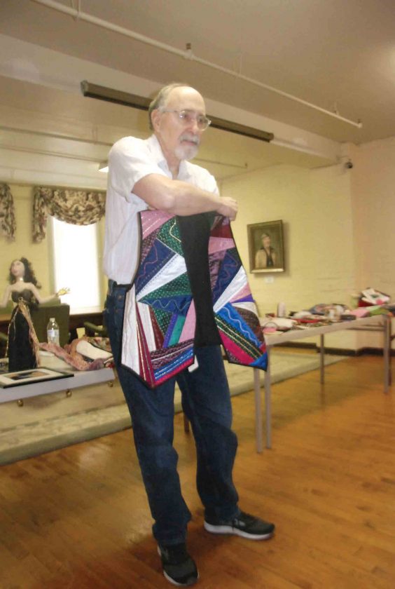 Kreinik Manufacturing owner Doug Kreinik displays a vest made with a number of the company’s products, including braided embellishments on the front, during a presentation Saturday at the Blennerhassett Museum of Regional History. (Photo by Evan Bevins)