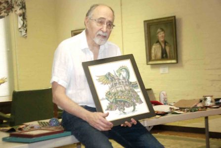 - Kreinik Manufacturing owner Doug Kreinik discusses a cross-stitched image using metallic thread during a presentation Saturday at the Blennerhassett Museum of Regional History during the 16th annual Mid-Ohio Valley Heritage Quilt Festival. (Photo by Evan Bevins)