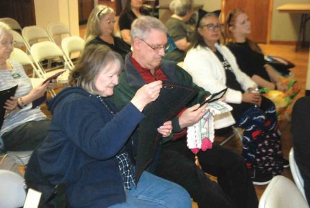 - Washington, W.Va., resident Charlotte Smith, left, and her husband Larry look at items made using Kreinik Manufacturing products during a presentation Saturday at the Blennerhassett Museum of Regional History. (Photo by Evan Bevins)