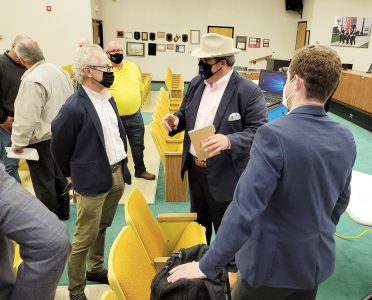 Parkersburg Mayor Tom Joyce, center, speaks with United Bridge Partners President and CEO Doug Witt, left, and Vice President of Business Development Ryan Dolan after a meeting of Parkersburg City Council’s Committee of the Whole on Thursday at the Municipal Building. (Photo by Evan Bevins)