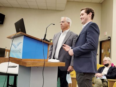 - United Bridge Partners Vice President of Construction and Operations Ken Szeliga, left, and Vice President of Business Development Ryan Dolan listen to a question from a Parkersburg City Council member during a meeting of the Committee of the Whole on Thursday at the Municipal Building. (Photo by Evan Bevins)