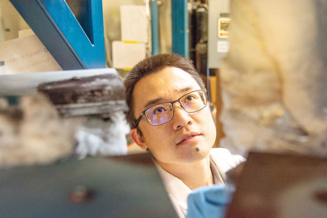 WVU engineers Xingbo Liu, Kostas Sierros and Wenyuan Li, who is the man pictured here, are developing technologies to upgrade critical components of power plants that frequently fail due to stress caused by continuous cycling of various energy sources. (WVU photo by Paige Nesbit)