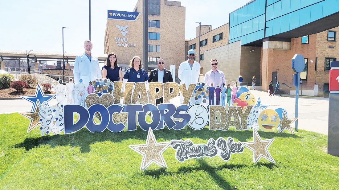 From left, Dr. Walter Kerschl, chief medical officer; Dr. Sarah Wescott, Hospitalist Department director; Dr. Gabriella Olson, Medicine Department director and chairwoman of the Medical Executive Committee; Dr. Bairava Kuppuswarmy, chief medical information officer; Dr. Geoffrey Cousins, chief of cardiovascular surgery; and Dr. Jeremy Parsons, Surgery Department director, gather for a photo outside WVU Medicine Camden Clark on Wednesday at a display celebrating National Doctors Day. (Photo by Evan Bevins)