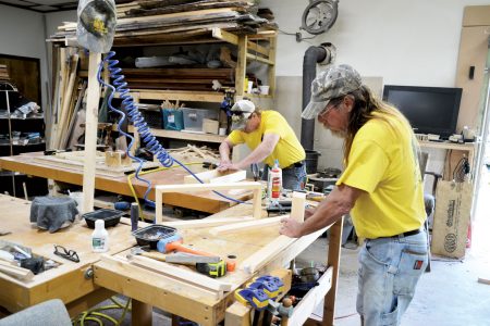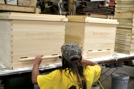 - Workers Dustin Estep, left, and Lenny Garland assemble hives at Bearsville Bees. (Photo by Douglass Huxley)