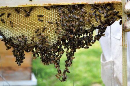 - Bees actively produce honey in a Layens frame at Bearsville Bees. (Photo by Douglass Huxley)