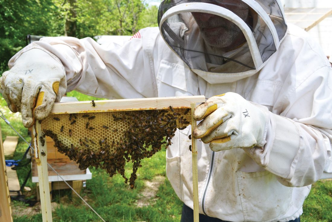 Bearsville Bees owner Bob Spencer holds a Layens frame with active bees. (Photo by Douglass Huxley)