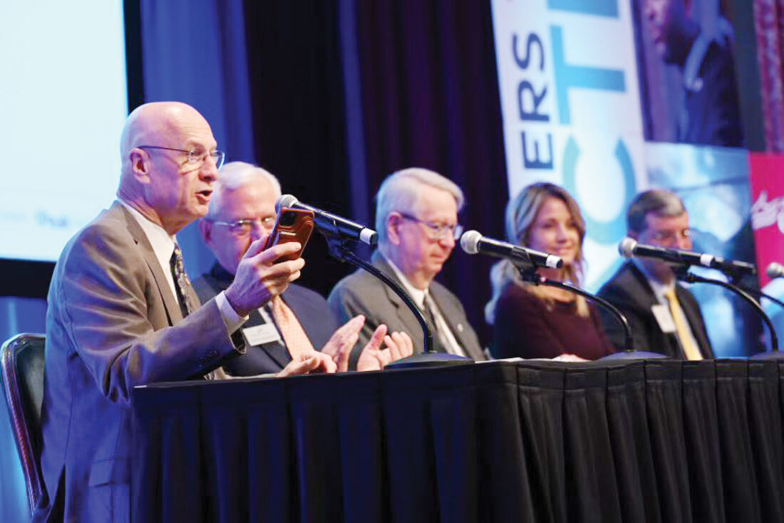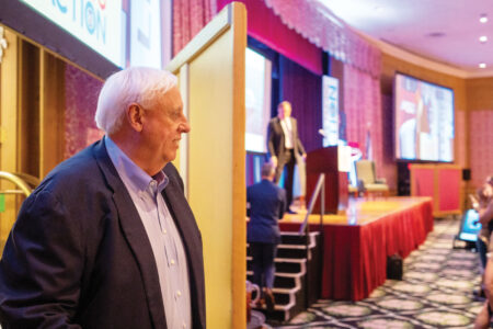 - Gov. Jim Justice, who attended the West Virginia Chamber of Commerce Annual Meeting and Business Summit, called for the state Senate to pass his personal income tax cut bill. (Photo courtesy of the WV Governor’s Office)