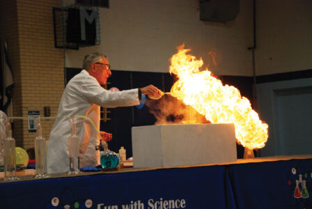 - Chemours senior chemist Leo Lech used lycopodium powder to create a combustion reaction during a Washington Works Fun with Science presentation Friday at Madison Elementary School in Parkersburg. (Photo by Evan Bevins)