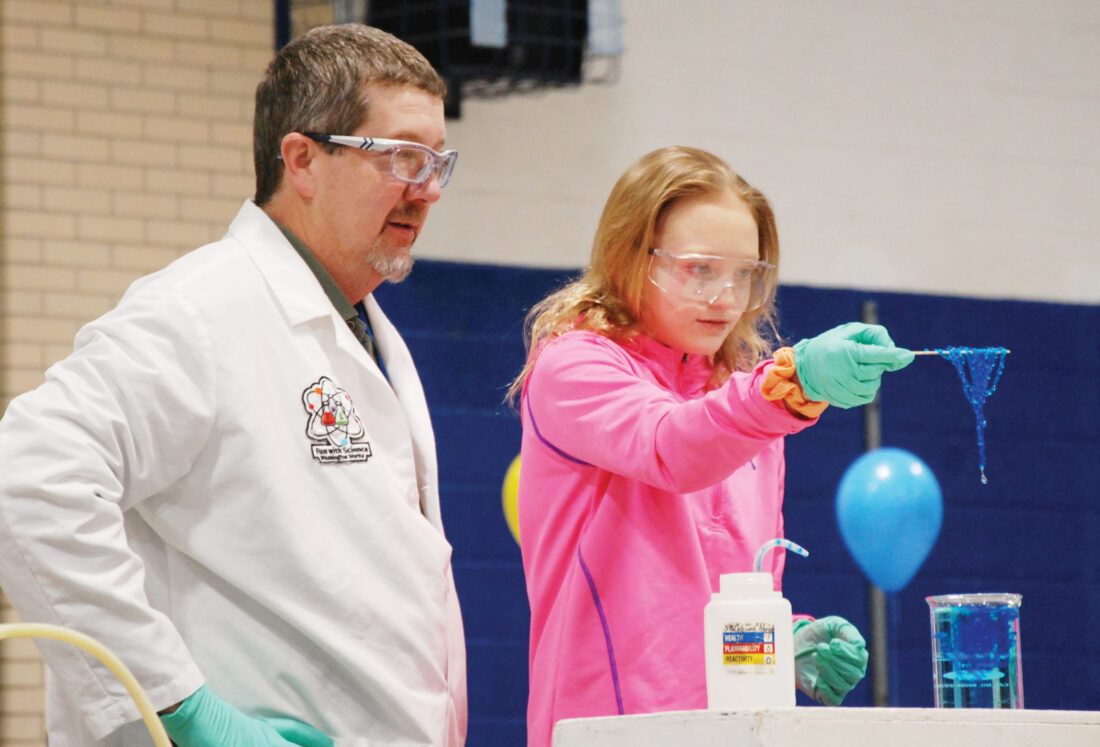 Madison Elementary School fourth-grader Lillyanne Winston, right, held up polymerized sodium algenate, a naturally occurring chemical found in seaweed, after pouring it in liquid form into a beaker containing a calcium chloride salt solution, under the direction of Brad Bishop, associate investigator at Chemours, during a Washington Works Fun with Science presentation Friday at the school. (Photo by Evan Bevins)
