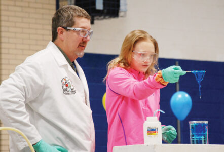 - Madison Elementary School kindergarteners Zaelynn Daugherty, left, and Hazel Ellis reacted to flames generated in a combustion reaction during a Washington Works Fun with Science presentation Friday in their school’s gym. (Photo by Evan Bevins)