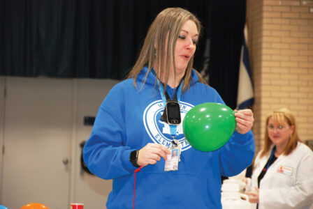 - Madison Elementary School kindergarten teacher Marcia Buckley carefully pushed a needle through a balloon at the material’s darkest points, where Chemours representatives explained polymers were closer together, preventing the balloon from popping, during a Washington Works Fun with Science presentation Friday at the school. (Photo by Evan Bevins)