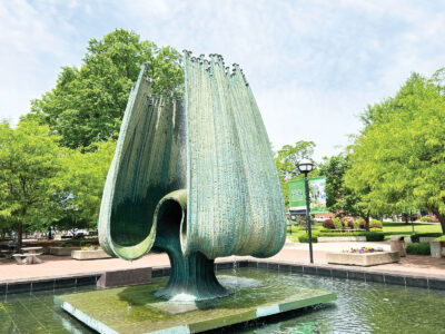Marshall University’s Memorial Fountain pays respect to the 75 lives lost in the 1970 Marshall football team plane crash. (Photo by Steven Allen Adams)