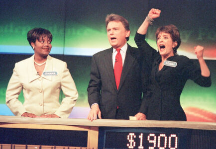 - Johnna Goodwin, left, watches as Donna Handel, right, reacts after winning on “Wheel of Fortune,” with host Pat Sajak during a taping of the game show in Philadelphia on April 17, 1999. (AP Photo)