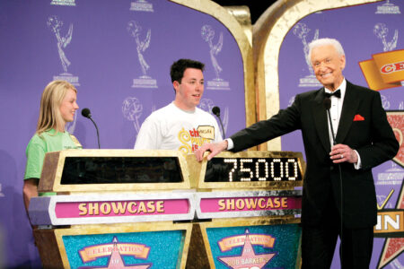 Host Bob Barker appears with contestants during filming of a special prime-time episode of "The Price Is Right," in Los Angeles on April 17, 2007. Actor-comedian Drew Carey replaced Barker on “The Price is Right” in 2007. (AP Photo)