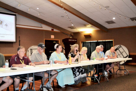 Board Members of Fenton Art Glass Collectors of America pause to listen to someone in the audience as they ask a question about the newly announced museum. President CC Hardman announced that the board had bought a building in Williamstown; the board plans to use this building as a Fenton glass museum. (Photo by Clara Noelle)