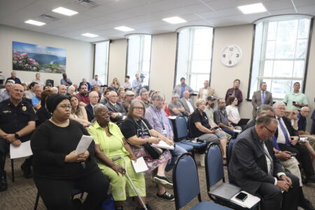 Local representatives and recovery advocates gather at the Raleigh County Courthouse in Beckley, W.Va. to select the southern West Virginia representative for the West Virginia First Foundation Board of Directors on Wednesday, July 5, 2023. The West Virginia First Foundation is a private nonprofit that will be responsible for distributing the lion's share of the over $1 billion collected by the state in opioid settlement money. (AP Photo)