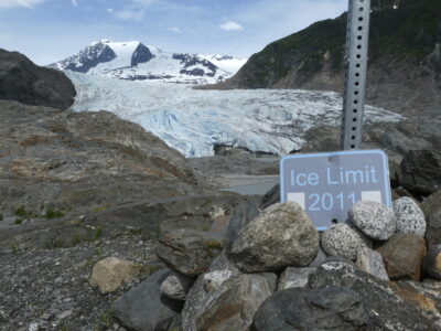 - The “Ice Limit 2011” sign shows the Mendenhall Glacier’s retreat on June 8, 2023, in Juneau, Alaska. As the Mendenhall Glacier continues to recede, tourists are flooding into Juneau. A record number of cruise ship passengers are expected this year in the city of about 30,000 people. (AP Photo/Becky Bohrer)