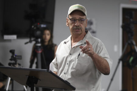 Darvin Markley, a Marion, Kansas, resident, speaks to the City Council about the local police's raids on the local weekly newspaper and the home of its publisher, Monday, Aug. 21, 2023, in Marion, Kansas. Markley says the police chief, who led the raid, should have been fired. (AP Photo/John Hanna)