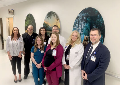 Memorial Health Systems Marketing Director Alexis Fazio (back row from left), Akron Children’s Pediatric Emergency Medical Director Brett Luxmore, Memorial Health System Clinical Nurse Manager Brittany Cunningham, Memorial Health Systems Director of Emergency & Urgent Care Services Brian Scharfenberg, Akron Children’s Division Director of Pediatric Emergency Medicine Laura Pollauf and Memorial Health System Vice President of Physician Services & Chief Medical Officer Dan Breece; and (front row from left) pediatric nurse Tori Duskey and pediatric ER tech Lauren Hall pose in the new Pediatric Emergency Department. (Photo by Michelle Dillon)