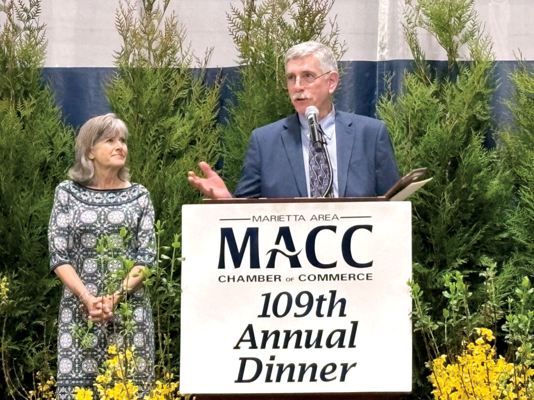 - Stephen Keiser, right, thanks everyone as he accepts the Marietta Area Chamber of Commerce Business Leader of the Year Award as his wife Anglea Keiser, left, watches during the MACC 109th Annual Dinner. (Photo by Michelle Dillon)