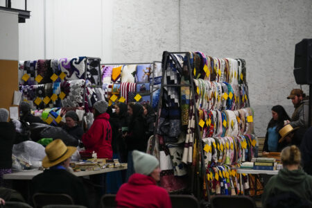 Attendees inspect quilts that will go up for auction during the 56th annual mud sale to benefit the local fire department in Gordonville, Pa., Saturday, March 9, 2024. Mud sales are a relatively new tradition in the heart of Pennsylvania's Amish country, going back about 60 years and held in early spring as the ground begins to thaw but it's too early for much farm work. (AP Photo/Matt Rourke)