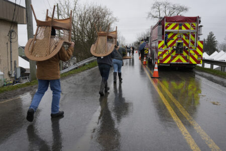 Attendees carry off there purchases from the 56th annual mud sale to benefit the local fire department in Gordonville, Pa., Saturday, March 9, 2024. Mud sales are a relatively new tradition in the heart of Pennsylvania's Amish country, going back about 60 years and held in early spring as the ground begins to thaw but it's too early for much farm work. (AP Photo/Matt Rourke)
