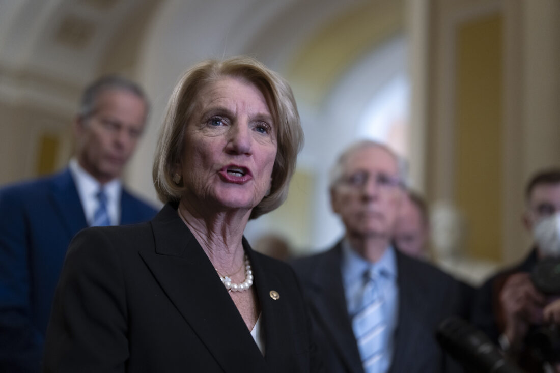 Sen. Shelley Moore Capito, R-W.Va., speaks to reporters following the Republican policy meeting, at the Capitol in Washington, Wednesday, March 20, 2024. (AP Photo/J. Scott Applewhite)
