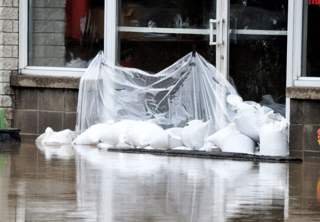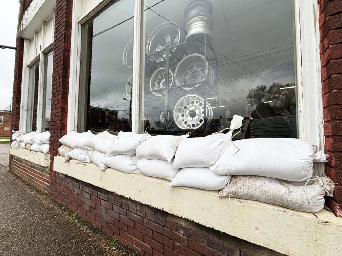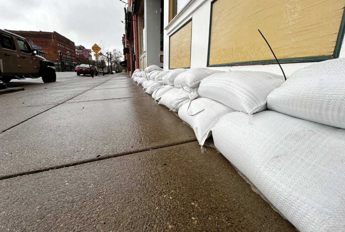 - Sandbags in front of Riverfront Sports on W. Montgomery Street Thursday morning. (Photo by Art Smith)
