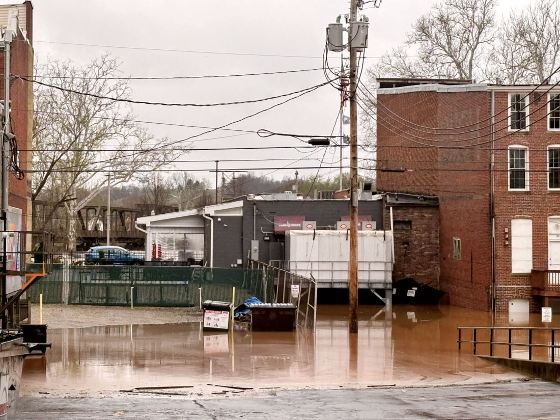 Water pools Thursday morning behind Marietta Wine Cellars on Second Street in Marietta due to heavy rains the last few days. (Photo by Michelle Dillon)