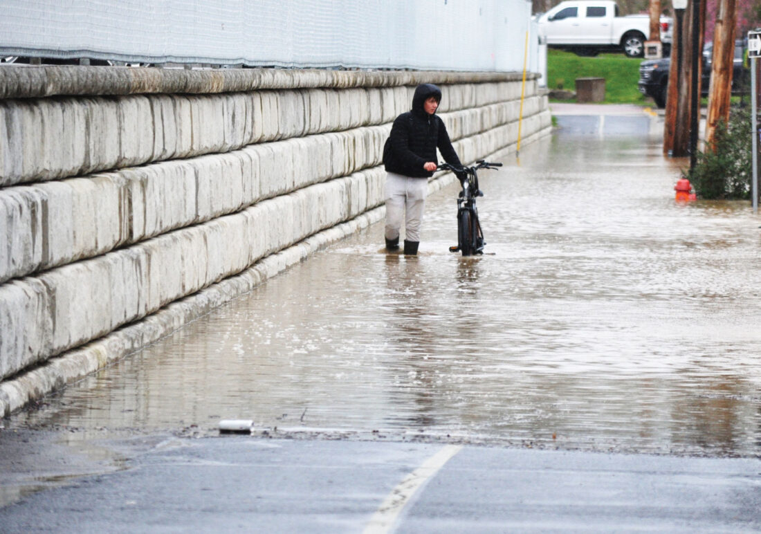 - Isaac Ventura pushes his bike through flood waters along the River Trail next to Post Street in downtown Marietta Thursday morning. (Photo by Art Smith)