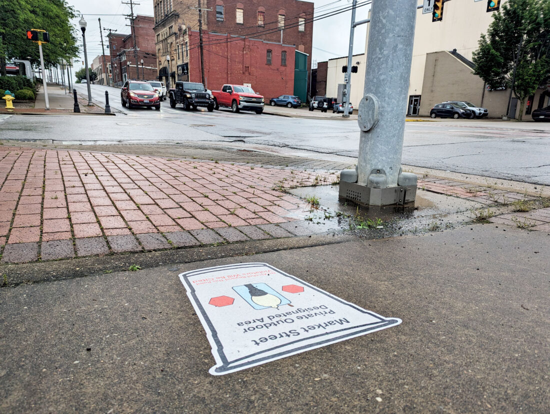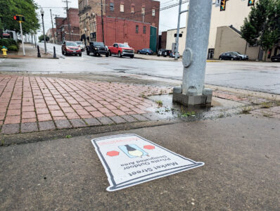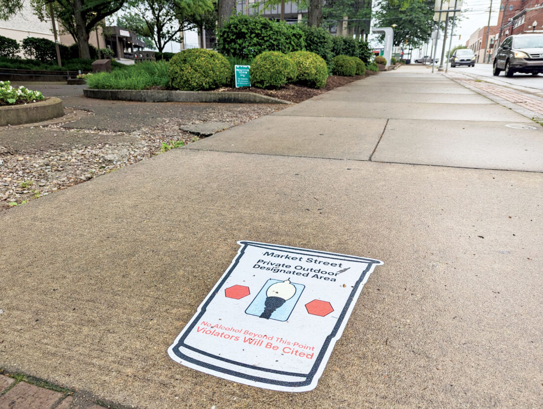 - A decal at Fifth and Market streets in downtown Parkersburg marks the end of the PODA zone, beyond which alcoholic beverages cannot be taken. (Photo by Evan Bevins)