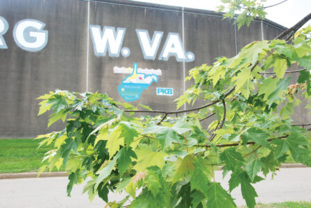- A new mural applied to the Parkersburg floodwall is seen through the leaves of a tree in Point Park Monday. Downtown PKB has scheduled a ribbon-cutting for the mural at 11 a.m. Wednesday. (Photo by Evan Bevins)