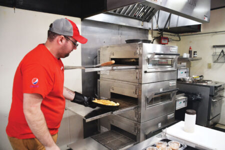 - Cody Moore pulls out some freshly baked cheese sticks during the Pizza Station on Third Street’s grand opening Friday. (Photo by Douglass Huxley)