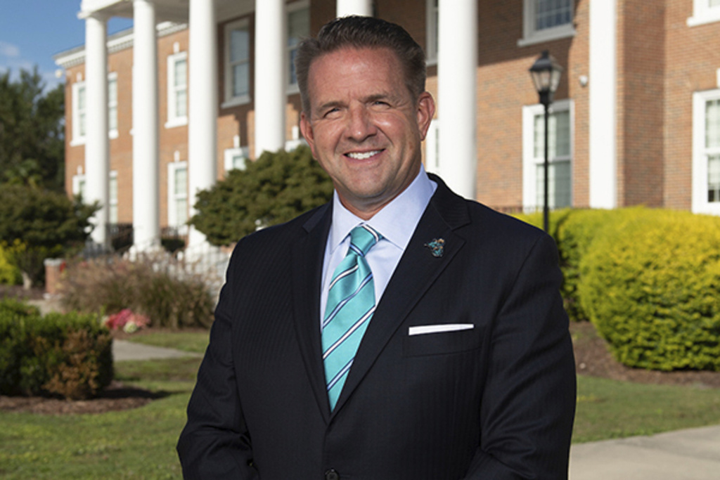 This photo provided by Judy Johns shows Coastal Carolina President Michael Benson at the school's campus in Conway, S.C., on Oct. 22, 2020. (Judy Johns via AP)