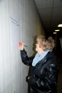 - Parkersburg resident Sue Ellen Waybright writes a response to a question about the former G.C. Murphy building in downtown Parkersburg during a tour of the building on Tuesday. (Photo by Evan Bevins)