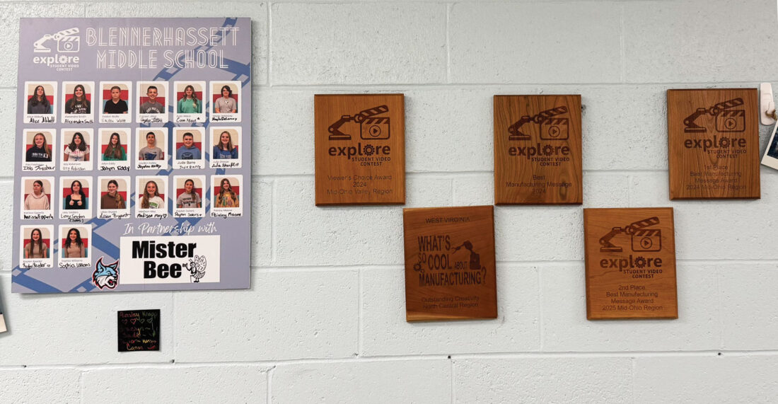 - Recent achievements are shown on the wall of Blennerhassett Middle School’s science and technology classes. More than 64 students across seventh and eighth grade classes participate in student-driven programs that include filming, editing and producing a daily morning show and taking part in the Explore the New Manufacturing Student Video Contest where they won first place at regionals and state last year with their Mr. Bee manufacturing video. (Photo Provided)