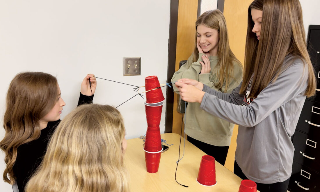 - Blennerhassett Middle School eighth-grade STEAM students Lillian Bryant, Raylen Reeder, Madison May and Paisley Maone collaborate to complete a tower building challenge at the 2024 West Virginia Manufacturing Association Learning Academy. (Photo Provided)